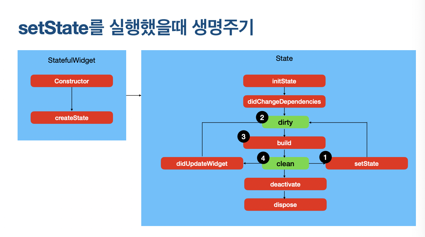 setState 역시 State가 clean한 상태에서만 실행될 수 있고, State내부에서 실행되며 build가 계속해서 재실행될 수 있게 해준다.