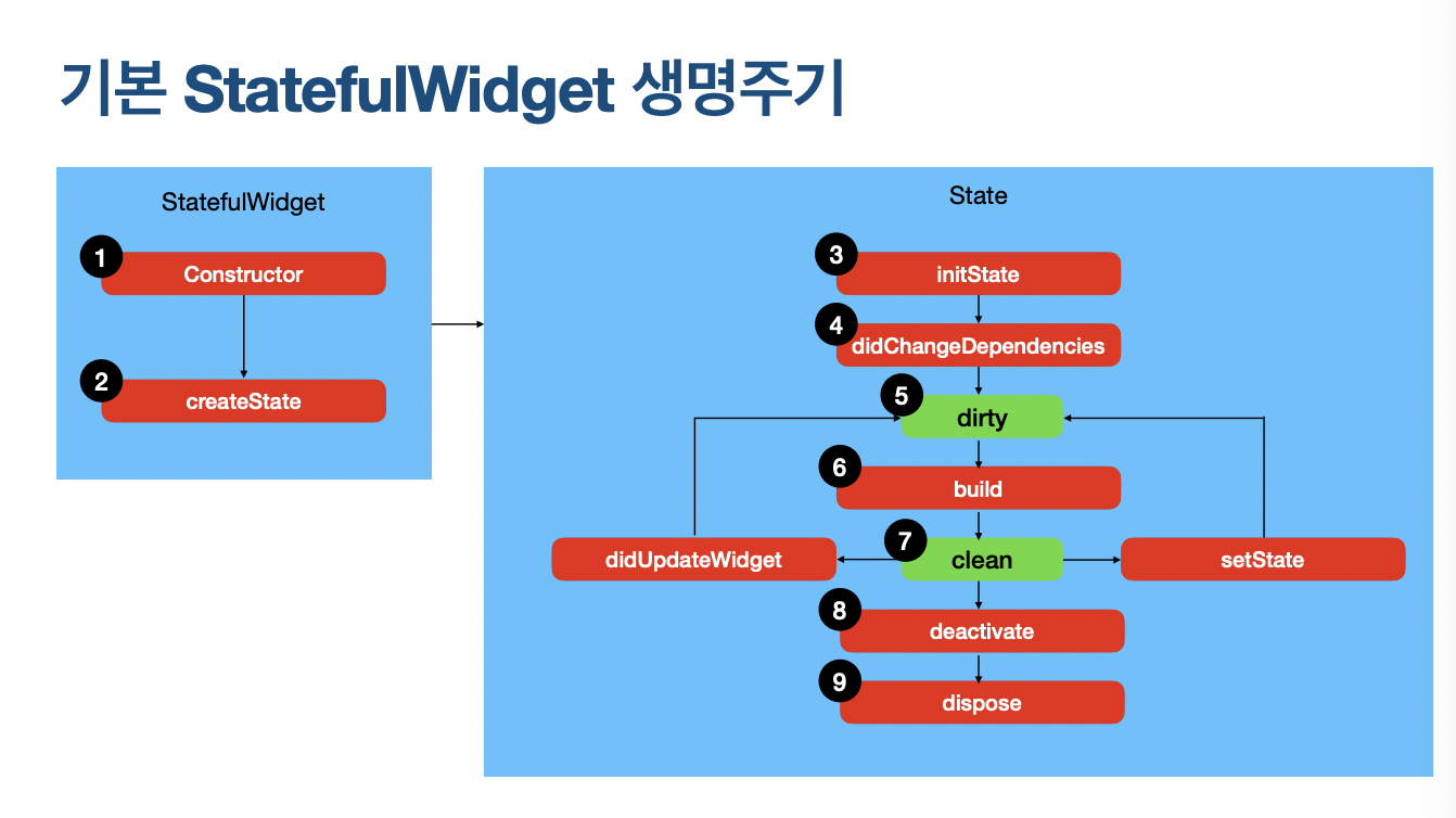 State에서는 initState를 통해 초기화를 진행하고(딱 한번 실행됨), didChangeDependency를 통해 dirty한 상태가 된다.