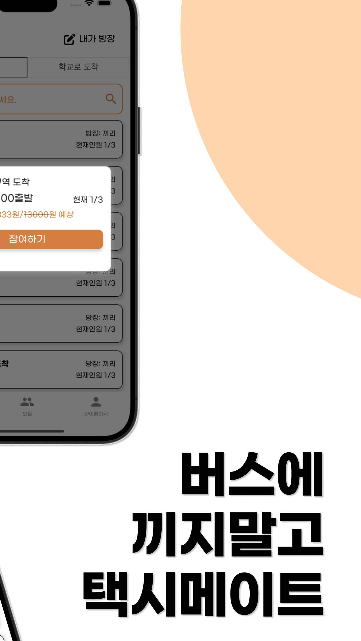 아침에 학교갈 때, 학교에서 집에 돌아올때, 쾌적하게 택시로 등하교하고 싶은데 가격이 부담되시나요? 택시메이트에서 등하교 택시를 같은 학교 학우들과 1/n가격으로 동승하세요! * 택시메