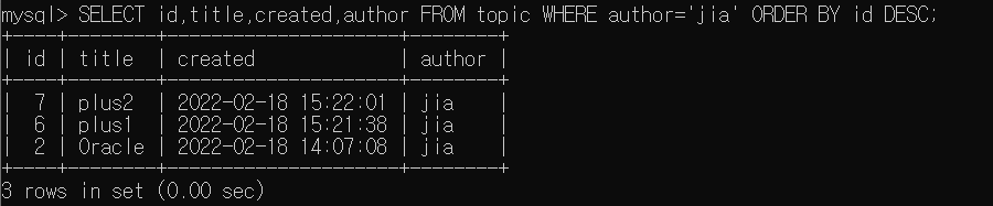 SELECT 칼럼명들(키들) FROM 테이블이름 WHERE 키='깂' ORDER BY 기준이 되는 칼럼 DESC(또는 ASC);