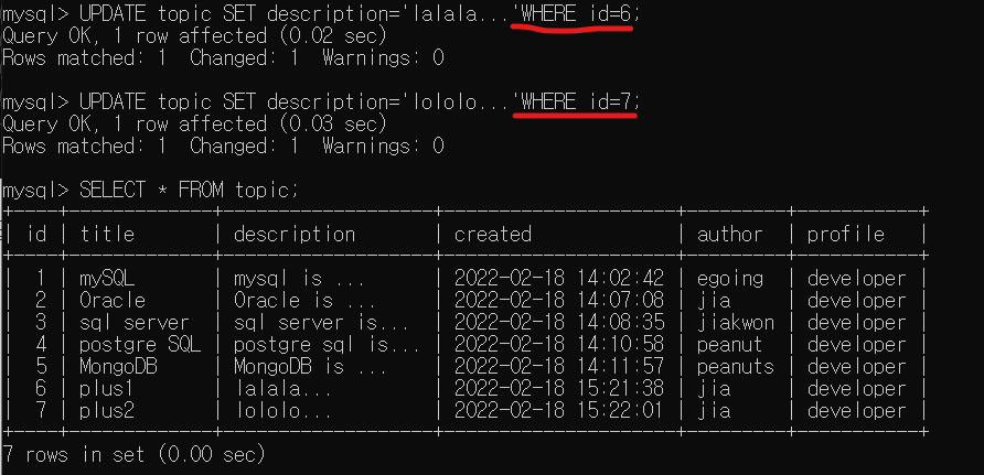 여기 id 6번 7번의 description을 보면 lalala lololo 뒤에 ...이 없다!