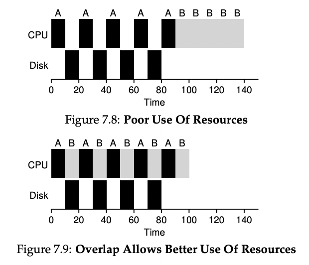 위의 그림을 보면 IO요청 때문에 A가 cpu를 쓸 수 없는 그 시간에 B가 대신 cpu를 사용한다. 이렇게 CPU와 IO가 오버랩되는 것을 허용함으로써 cpu를 더 효율적으로 사용할 수 있게 되는 것이다. (이 경우 성능이 40%이상 개선됨)