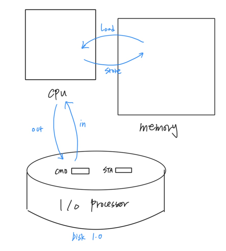 그래서 예를 들어 running중인 어떤 프로세스가 write()라는 system call을 수행한다면, cpu는 이 명령을 io processor로 보내는 out()명령을 수행할때까지만 개입하고, 그 이후에는 이 작업이 다 끝날때까지 더이상 할 일이 없어진다.