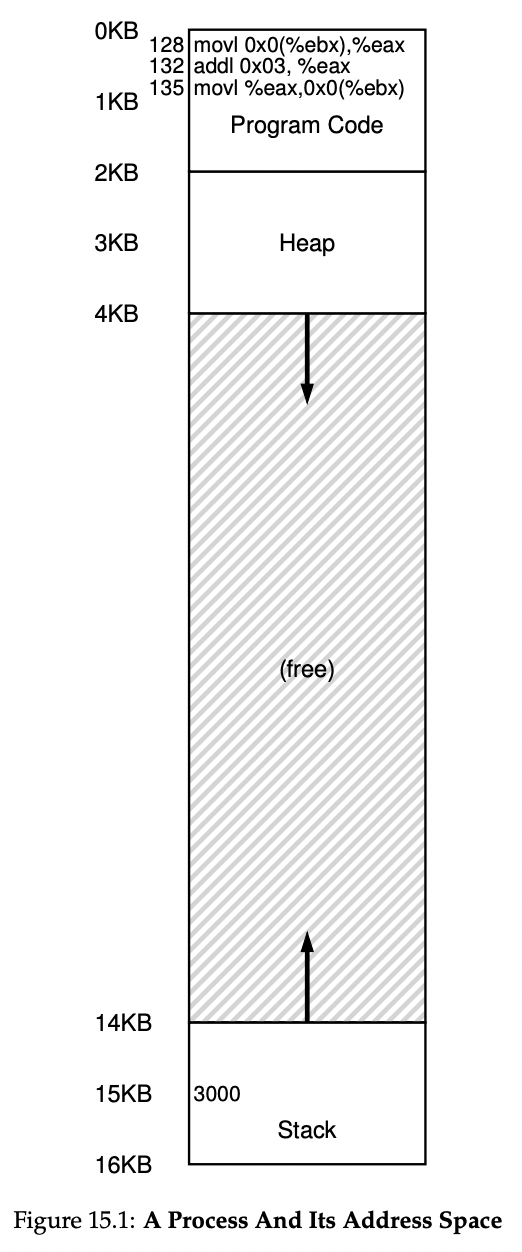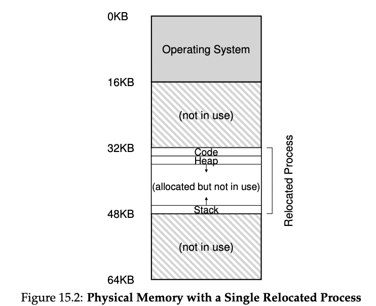 그림 속 프로세스의 address space에서는 코드가 oKB부터 들어있지만 물리적 메모리에서는 그와 다르게 32KB부터 시작한다.