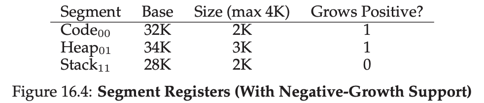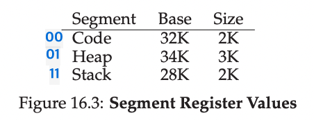우리가 살펴보는 주소공간은 16KB이므로 14bit를 쓰는데, 상위 2bit는 세그먼트를 판별하는데에 사용하고 나머지 12bit는 offset에 사용한다. offset이란 segment 시작부터의 거리이므로 여기서는 2^12 = 2^2 * 2^10 = 4KB가 segment의 크기가 된다.