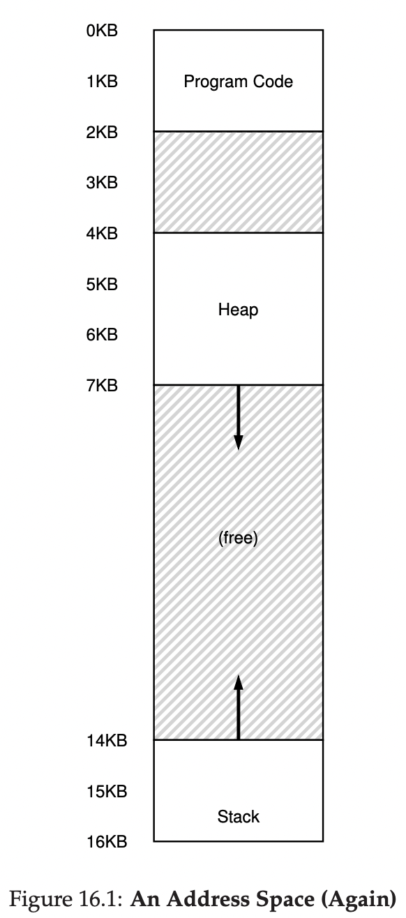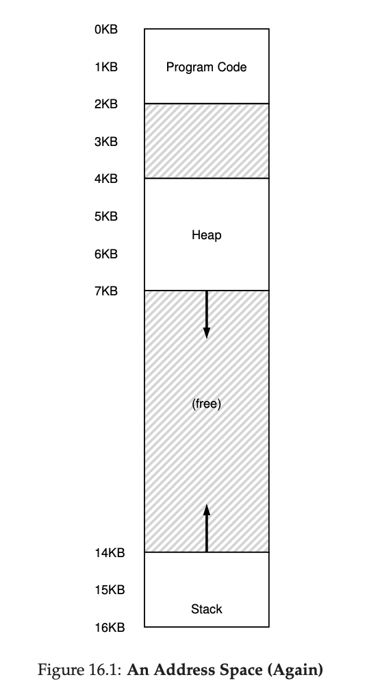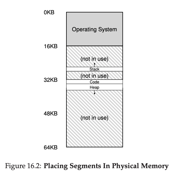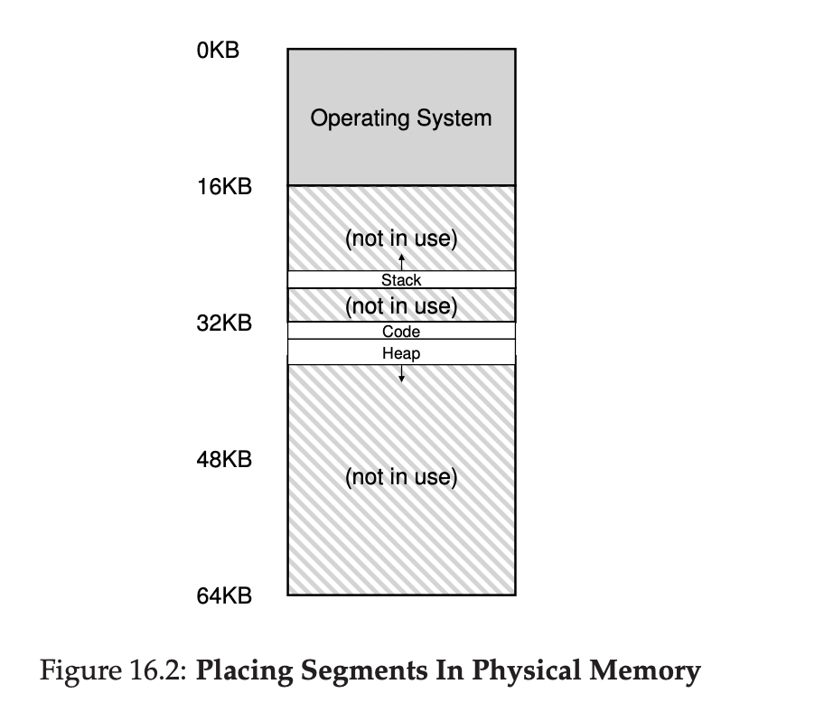 segmentation은 virtual address space에서 사용하지 않는 빈공간을 굳이 물리적 메모리로 옮길 필요가 없다는 아이디어에서 시작한다. 즉, 가상주소공간에서 사용하지 않는 공간은 물리적 메모리에도 배치하지 않는다는 것이다.