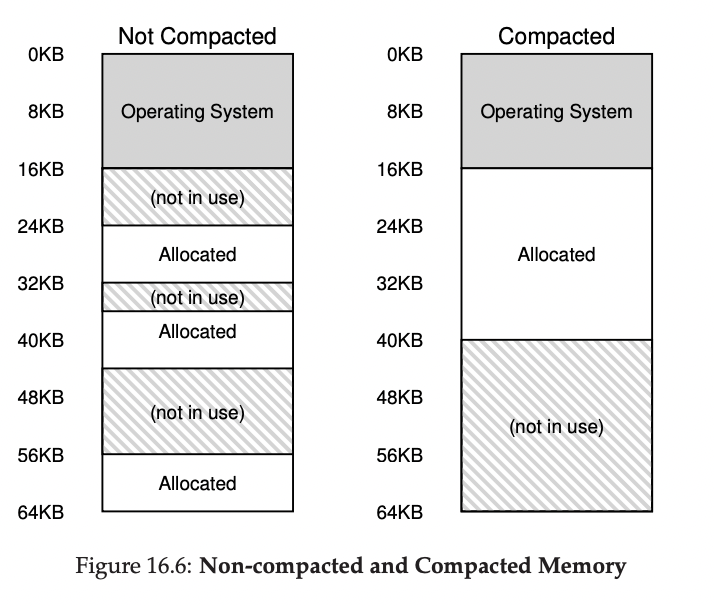 3. managing free space in physical memory : free list로 free공간을 관리하다가 external fragmentation이 발생하면 모든걸 중단하고compaction을 통해 한쪽으로 몰아 해결한다.