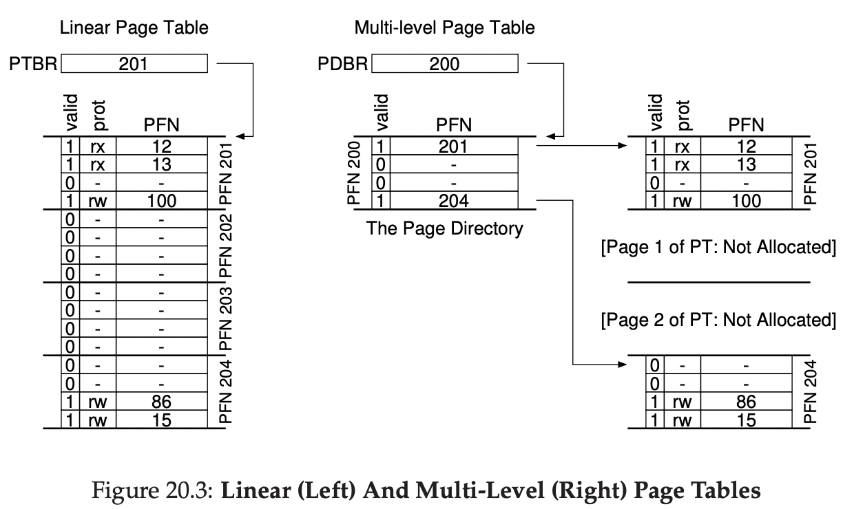 이것을 오른쪽 그림처럼 multi level page tables로 개선하면 저 중간에 있는 불필요한 공간들은 실제 물리메모리에 할당하지 않고, 필요한 페이지테이블만 page frame크기에 맞추어 물리메모리에 둘 수 있다.