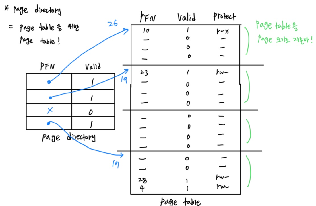 page table을 page크기로 자르고, 이 각각의 page table의 시작주소를 page directory에 둔다.