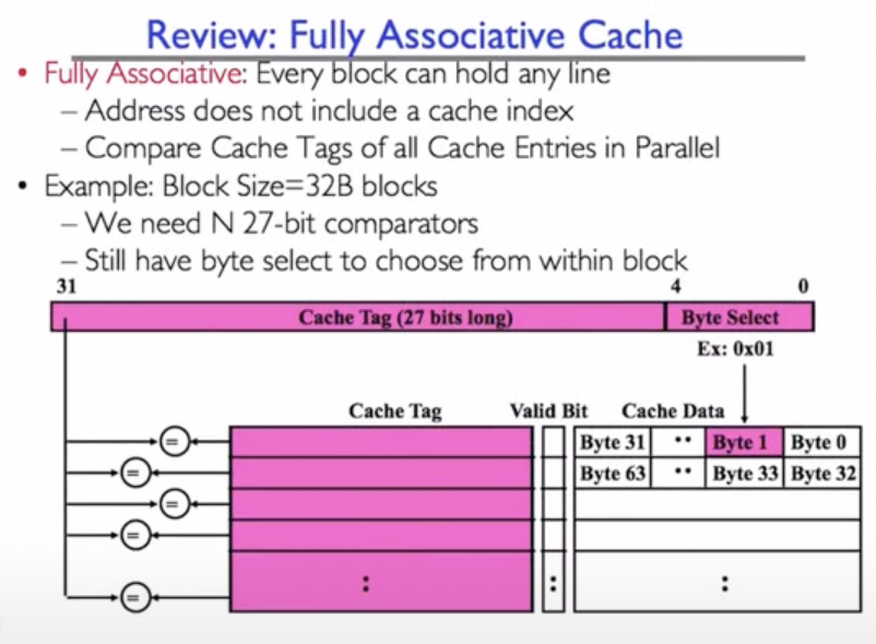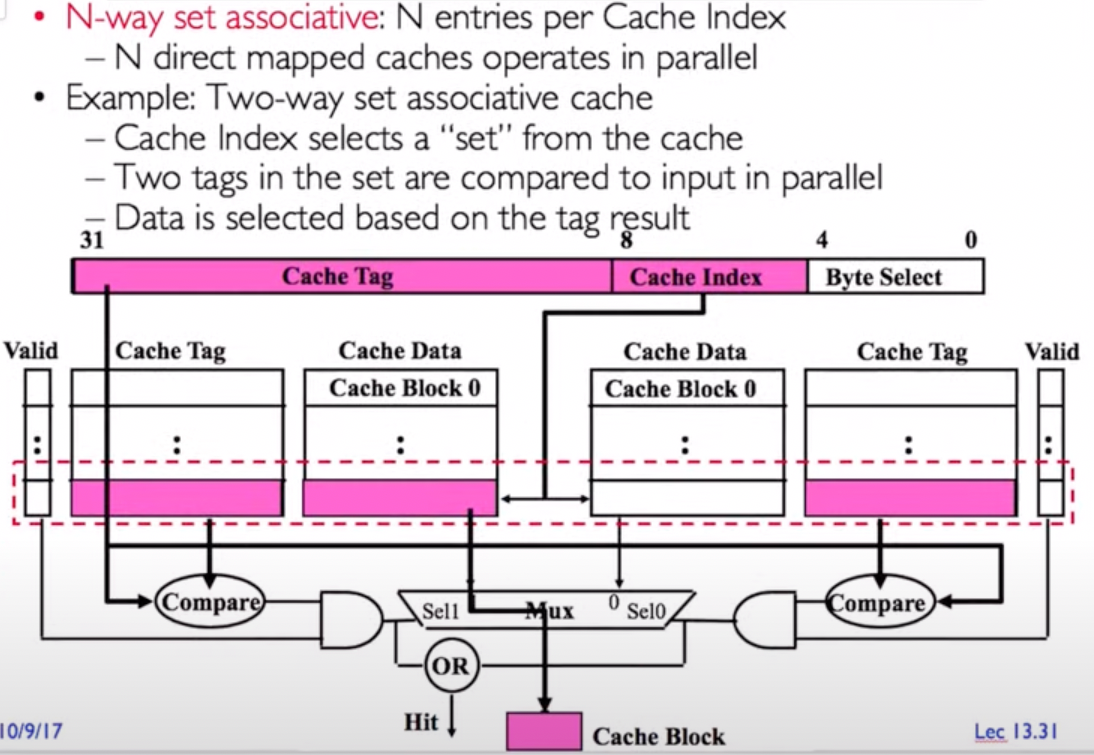 위 그림은 2-way set associative cache를 보여주고 있다. 이를 위해 인덱스를 반으로 줄여서 옆으로 붙인것을 확인할 수 있다. (cache index bit는 1자리 줄고 cache tag bit가 1자리 늘어남)