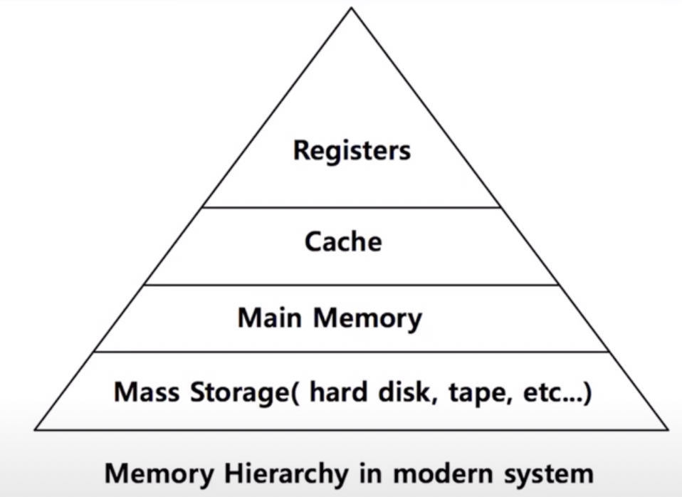 프로세서에 가까워질수록 용량은 작고 스피드는 빠르다. 반대로 프로세서에서 멀어질수록 용량은 크지만 스피드는 매우 느리다.
