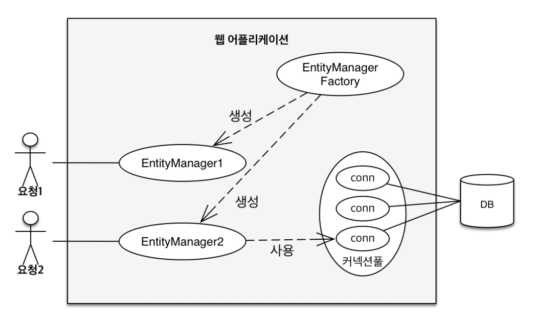 엔티티 매니저 팩토리와 엔티티 매니저 고객의 요청이 올 때마다 엔티티매니저를 생성하고, 이 엔티티 매니저는 데이터 커넥션을 사용해서 db에 접근하게 된다. 영속성 컨텍스트란? 영속성 컨텍스트란, 엔티티를 영구 저장하는 환경이다. 논리적인 개념으로 눈에 보이지는 않고 엔티티 매니저를 통해서 영속성 컨텍스트에 접근한다. //엔티티를 영속성 컨텍스트에 저장한다. EntityManager.persist(entity); 엔티티 생명주기 1. 비영속 (new/transient) = 영속성 컨텍스트와 전혀 관계가 없는 새로운 상태 2. 영속 (managed) = 영속성 컨텍스트에 관리되는 상태 3. 준영속 (detached) = 영속성 컨텍스트에 저장되었다가 분리된 상태 4. 삭제 (removed) = 삭제된 상태 ..