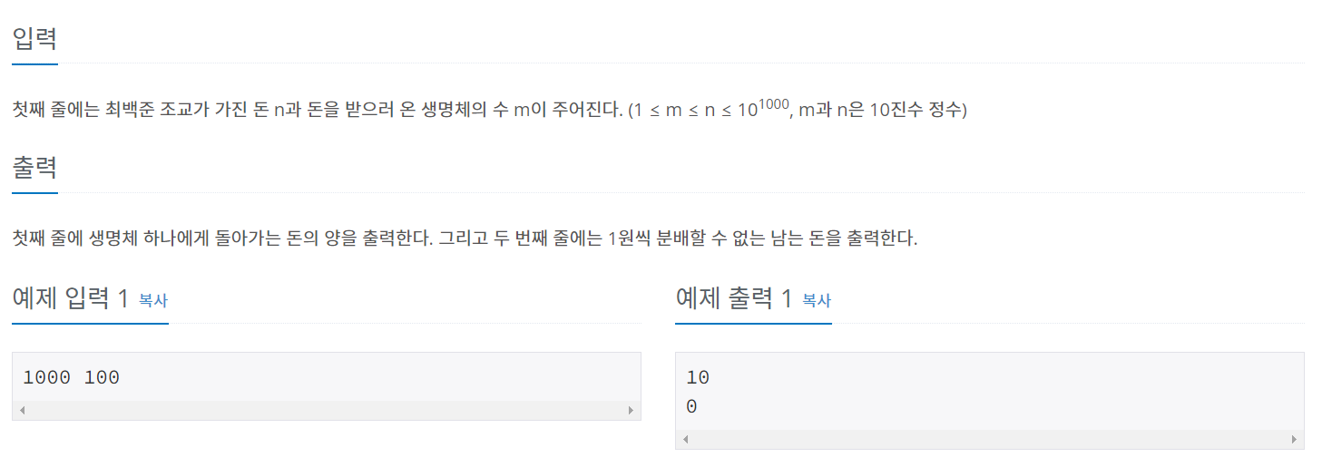 정말정말 간단한 로직의 문제인데도 이유모를 런타임에러로 엄청 헤멨던 문제,,,ㅠㅠ 내가 헤멨던 과정을 적어보고자 한다. 1. 첫번째 시도 >> scanner만 사용 import java.util.Scanner; public class Main { public static void main(String[] args) { Scanner scanner = new Scanner(System.in); int money = scanner.nextInt(); int life = scanner.nextInt(); System.out.println(money/life); System.out.println(money%life); } } 너무 쉽다고 생각하고 scanner로 작성했는데 어림도없이 런타임오류가 떴다. 여기까지..